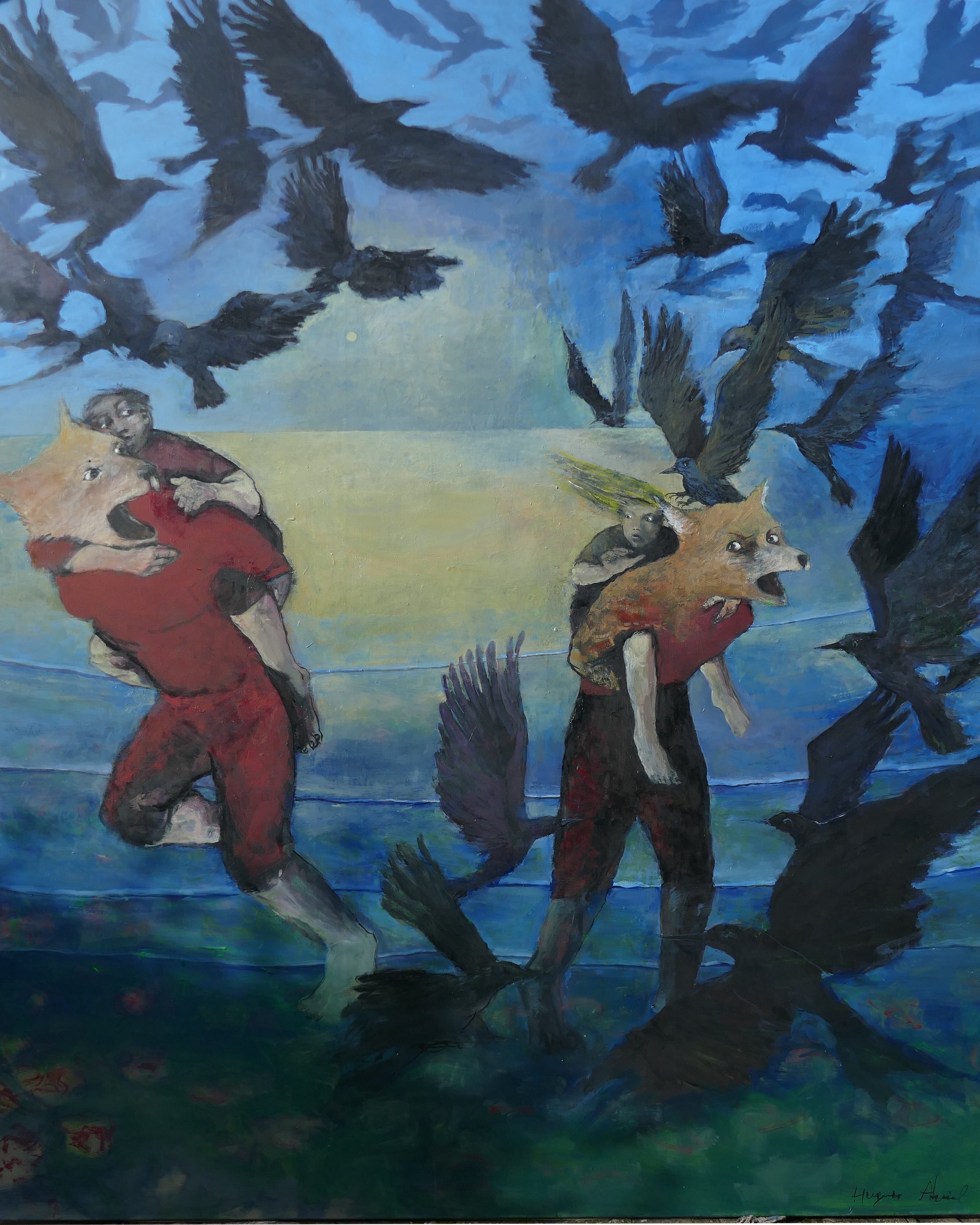 Lors d’un séjour à Beyrouth en 2014 j’avais pu constater combien les traumatismes restaient visibles et combien la population restait aux aguets. Pendant le séjour, Daeh a tenté en vain d’envahir le Liban depuis la Syrie où l’état islamique s’était alors implanté. Cette toile ainsi que « Rescapés. 15T02″ et « famille en fuite. 14T22″ faisaient partie de cette présentation, comme témoignage de ces traumatismes sur la population.